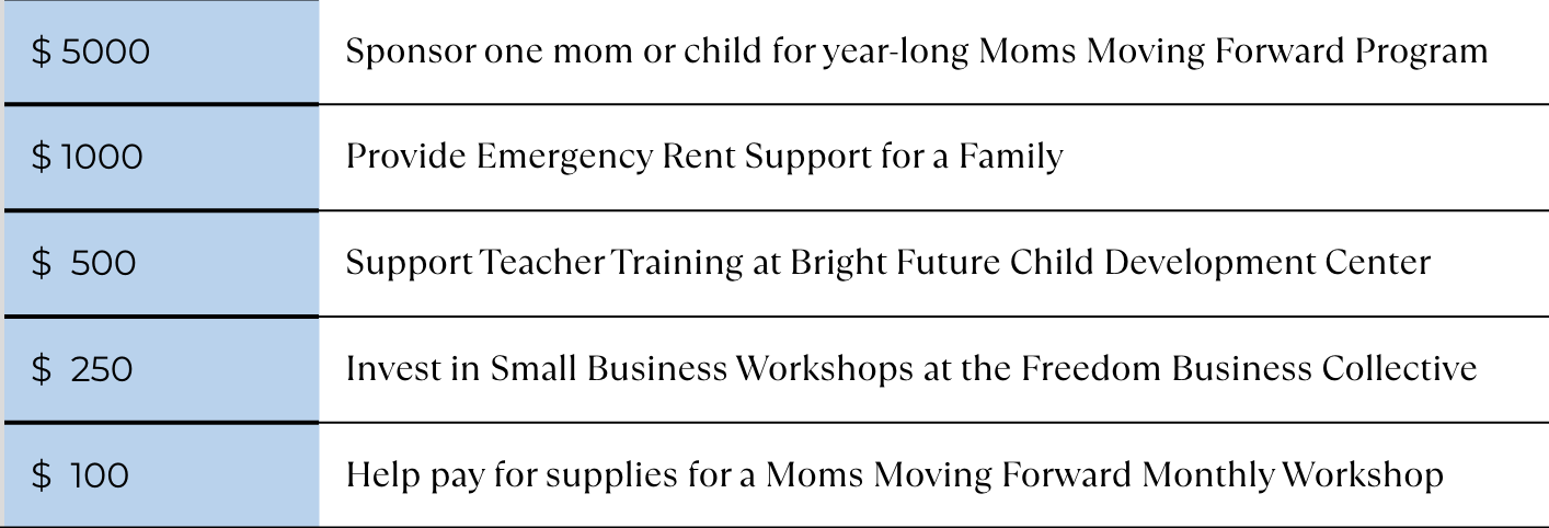 “I learned how to take care of myself so I could take care of my kids….I was living in a hotel, trying to make it and (Freedom Communities) found me a place to stay and showed me how to apply for apartments. That’s what Moms Moving Forward is all about—getting you ready, setting you up for success. This program took the load off of me, it gave me a little help. All we moms need is a little help, a little push. I want all the donors and the supporters to know from the bottom of my heart, you are appreciated. We moms are grateful.”